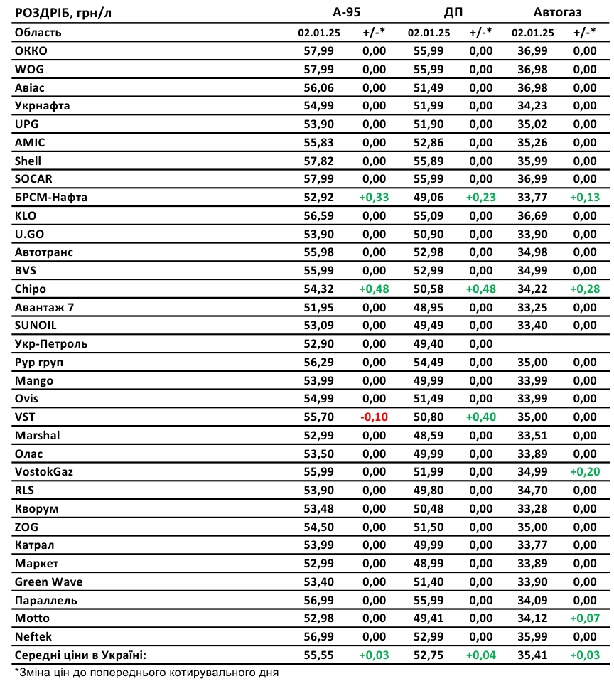 За даними моніторингу, середні роздрібні ціни 2 січня 2025 року на бензин А-95 становлять 55,55 гривень за літр (+4,07 гривні за рік), на дизельне паливо 52,75 гривень за літр (1,25 гривні), на автогаз 35,41 гривень за літр (5,58 гривні).