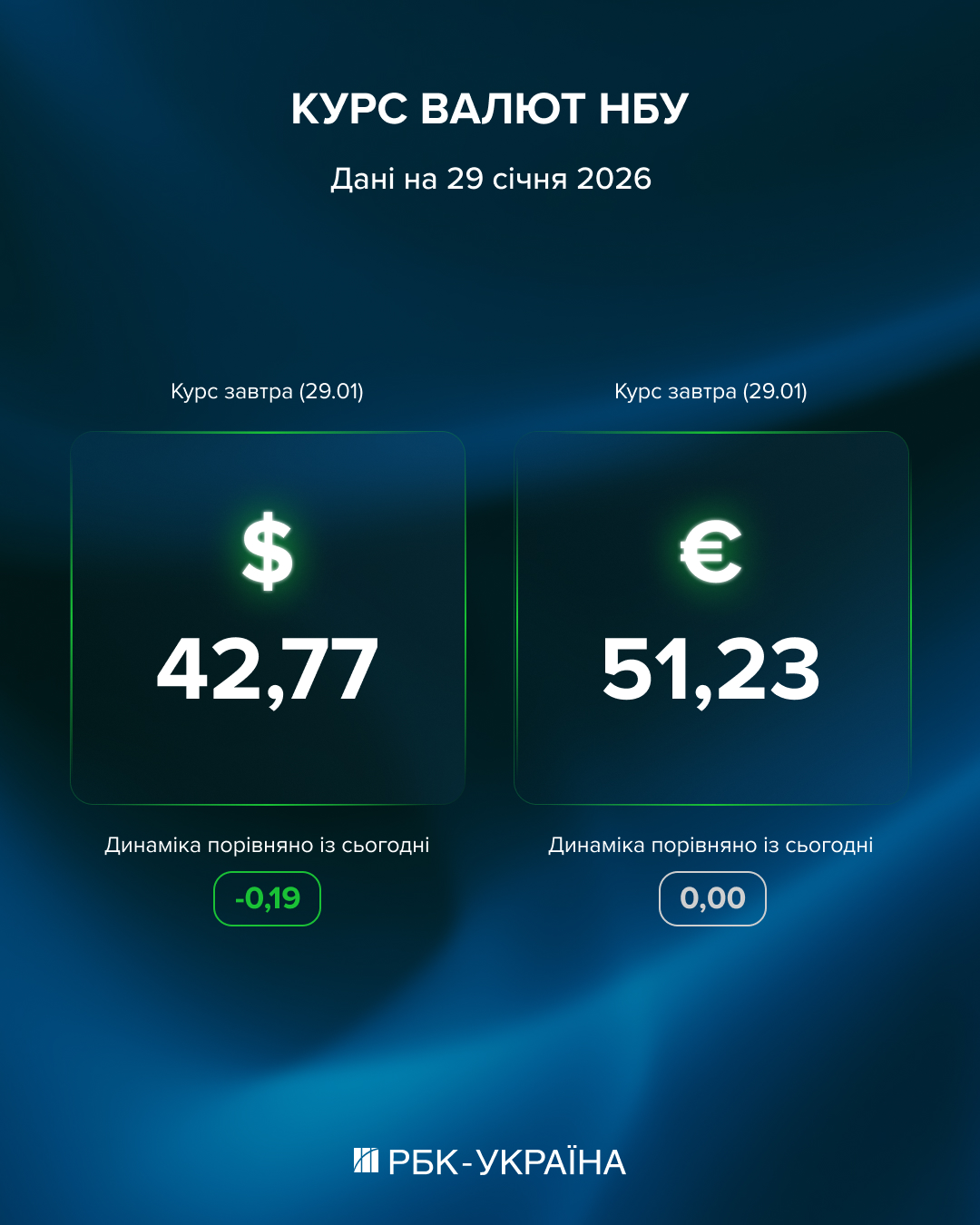 Нагадаємо, на ранок 28 січня середні готівкові курси євро встановилися на такому рівні 50,90-51,76 гривень (купівля-продаж), а долара – 42,64-43,23 гривень. Найбільші банки за кількістю вкладників продавали євро по 51,50-51,80 гривень, а долар – по 43,02-43,20 гривень.