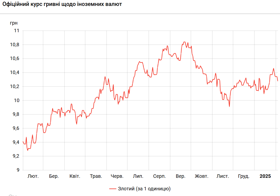 Офіційний курс на 31 січня 2025 року встановлено на такому рівні: 10,2782 гривень за 1 злотий (-0,0651 грн).