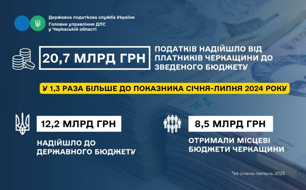 Платники Черкаської області за січень-липень 2025 року сплатили до бюджетів усіх рівнів 20,7 млрд грн податків, зборів та платежів. Порівнюючи з аналогічними показниками минулого року, до бюджетів спрямували на 4,5 млрд грн або в 1,3 раза податків більше.
