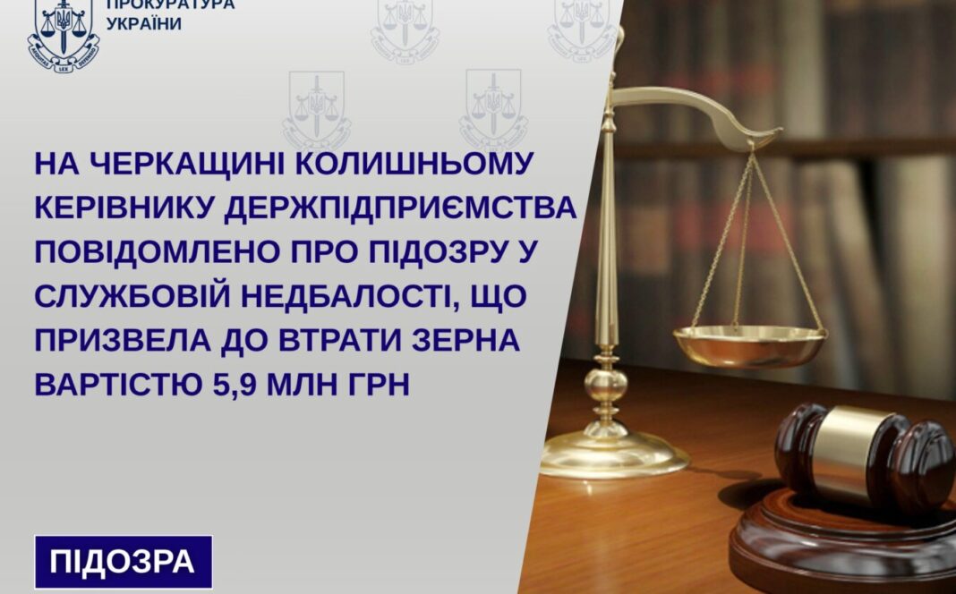 На Черкащині колишньому керівнику держпідприємства повідомлено про підозру в недбалості, що призвела до втрати зерна на 5,9 мільйона гривень.
