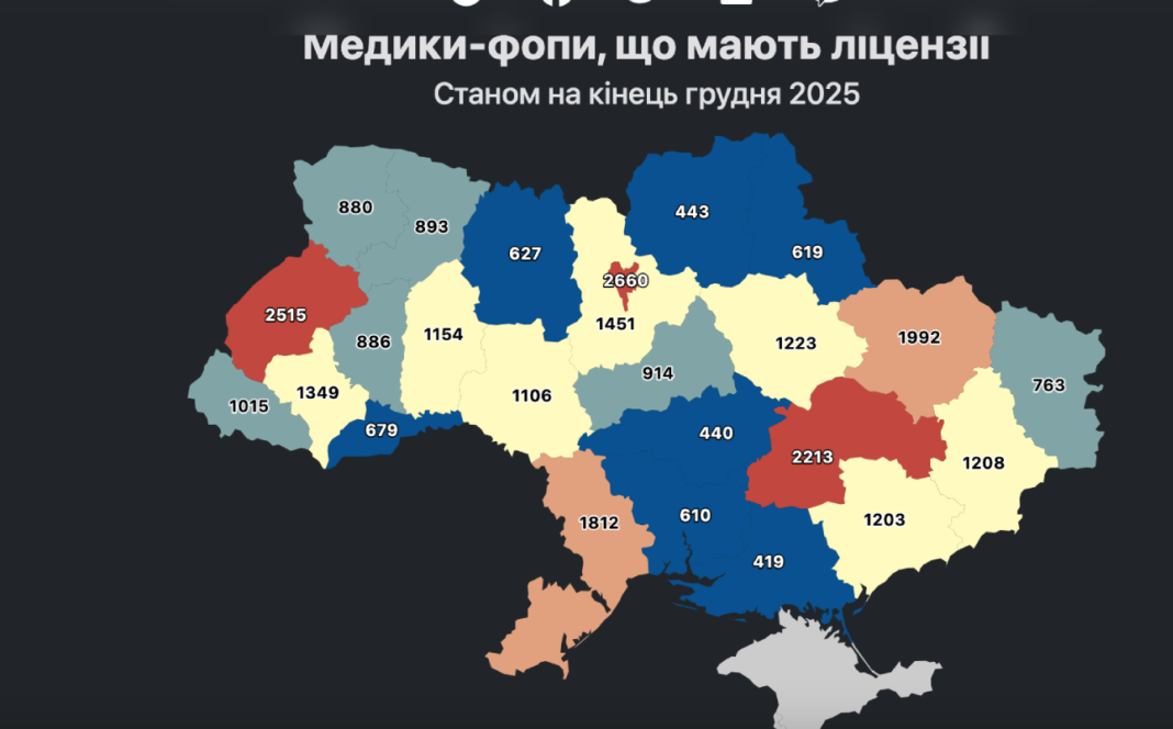 Найбільше медиків-фопів працює у Києві — 2,6 тисячі. Наслідує Львівщина (2,5 тисячі) та Дніпропетровщина (2,2 тисячі). А от найменше таких ліцензій видано лікарям з Херсонської, Кіровоградської, Чернігівської та Миколаївської областей.