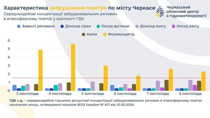 • формальдегід перевищував ГДК с.д. у 1,8-5,6 раза в Дніпровському мікрорайоні з 3 по 8 листопада;
