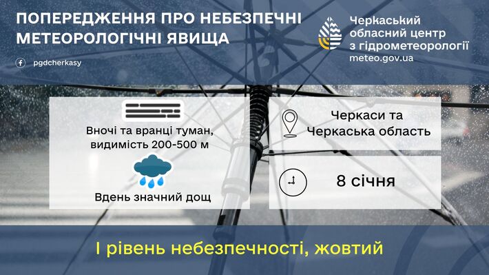 Зокрема, 8 січня на Черкащині очікується туман. Видимість становитиме лише 200-500 метрів. Удень також розпочнеться значний дощ (15-49 мм за 12 годин і менше).