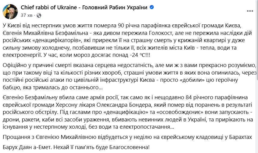 «У Києві від нестерпних умов життя померла 90 річна парафіянка єврейської громади Києва, Євгенія Михайлівна Безфамільна – яка дивом пережила Голокост, але не пережила наслідки дій російських «денацифікаторів», які прирекли її на страшну смерть у крижаній квартирі у дуже сильну зимову холоднечу, позбавивши не тільки її, всіх жителів міста Київ – тепла, води та електроенергії. У час, коли мороз досягає понад -24 ℃!», – йдеться у дописі.