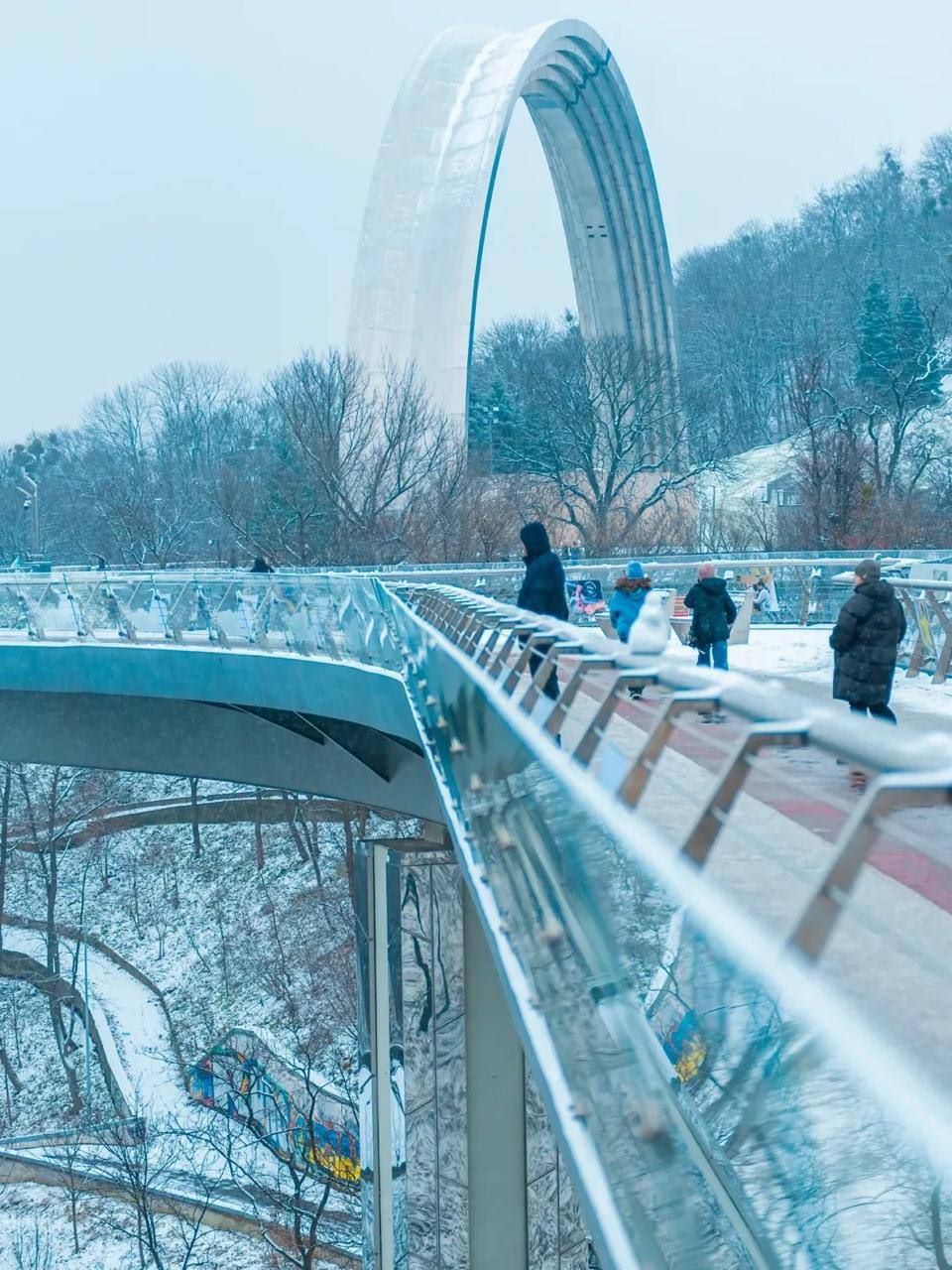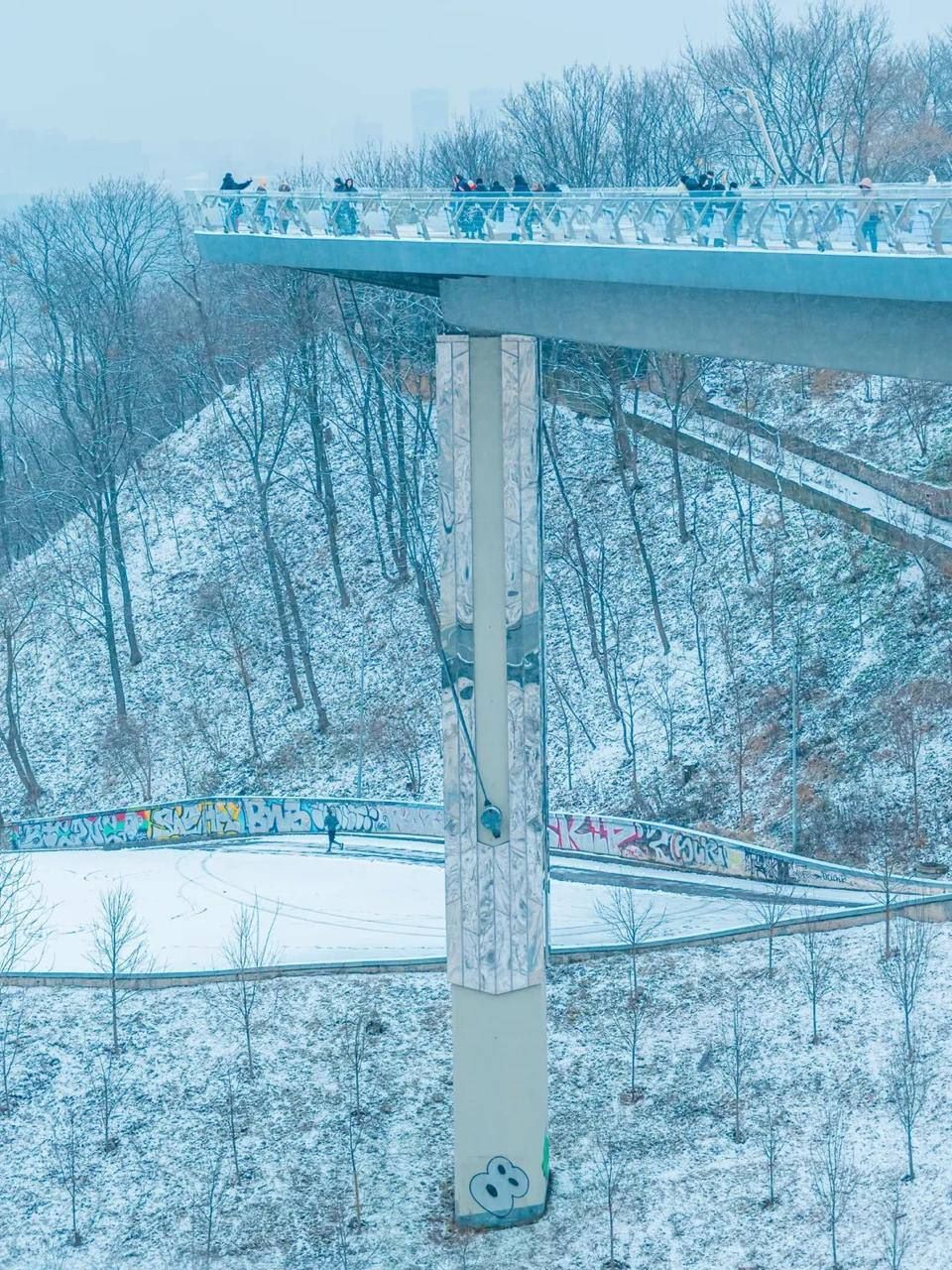 Однією з небагатьох локацій, де можна зустріти людей, став знаменитий пішохідно-велосипедний міст через Володимирський узвіз. Поодинокі мешканці та гості міста прийшли сюди, щоб насолодитися панорамою Дніпра та зробити перші кадри року.