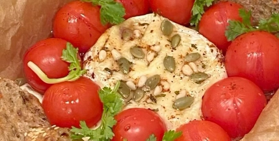 На деко, застелене пергаментним папером, викласти сир, зробивши зверху надрізи, як показано на відео. Помідори чері розкласти цілими навколо сиру. Наступне коло — порізаний на тонкі шматочки багет. Усе посипати травами, горішками і полити оливковою олією та медом.