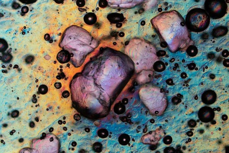 Тонка кристалічна плівка сахарози, отримана на мікрофотографії в поляризованому світлі Фото: гравитация