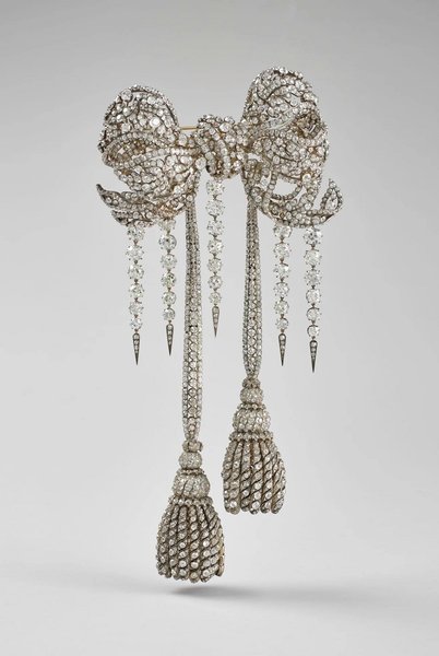 Також зникла її брошка-бант, діамантова прикраса на корсаж. Ювелір Франсуа Крамер створив цей каскад діамантових і рожевих діамантів у позолоченому сріблі між 1855 і 1864 роками.