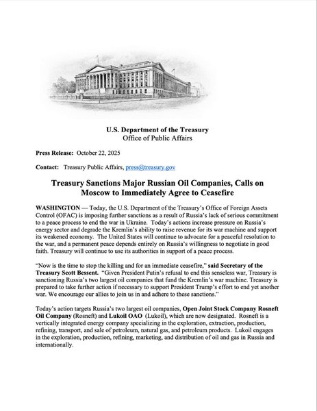 США ухвалили рішення про накладення санкцій проти "Лукойлу" та "Роснефти" і їхніх дочірніх компаній. Про це йдеться у пресрелізі Міністерства фінансів США, оприлюдненому увечері 22 жовтня.