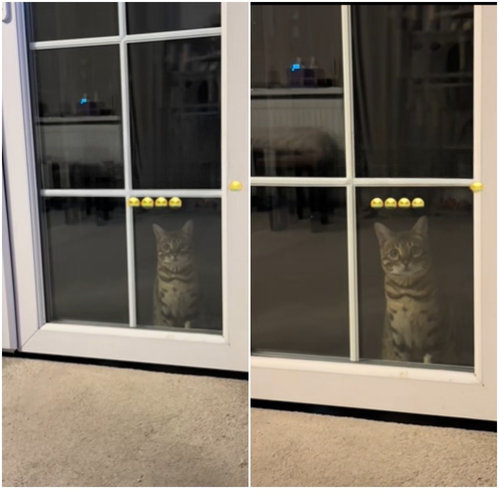 Тварина, відчуваючи тривожність через розлуку зі своєю людиною, злякано бігала кімнатою. Після цього кішка всілася біля дверей зі скляними вставками, за якими за реакцією спостерігала жінка, й збентежено поглядала крізь них, роззираючись довкола у пошуках власниці.